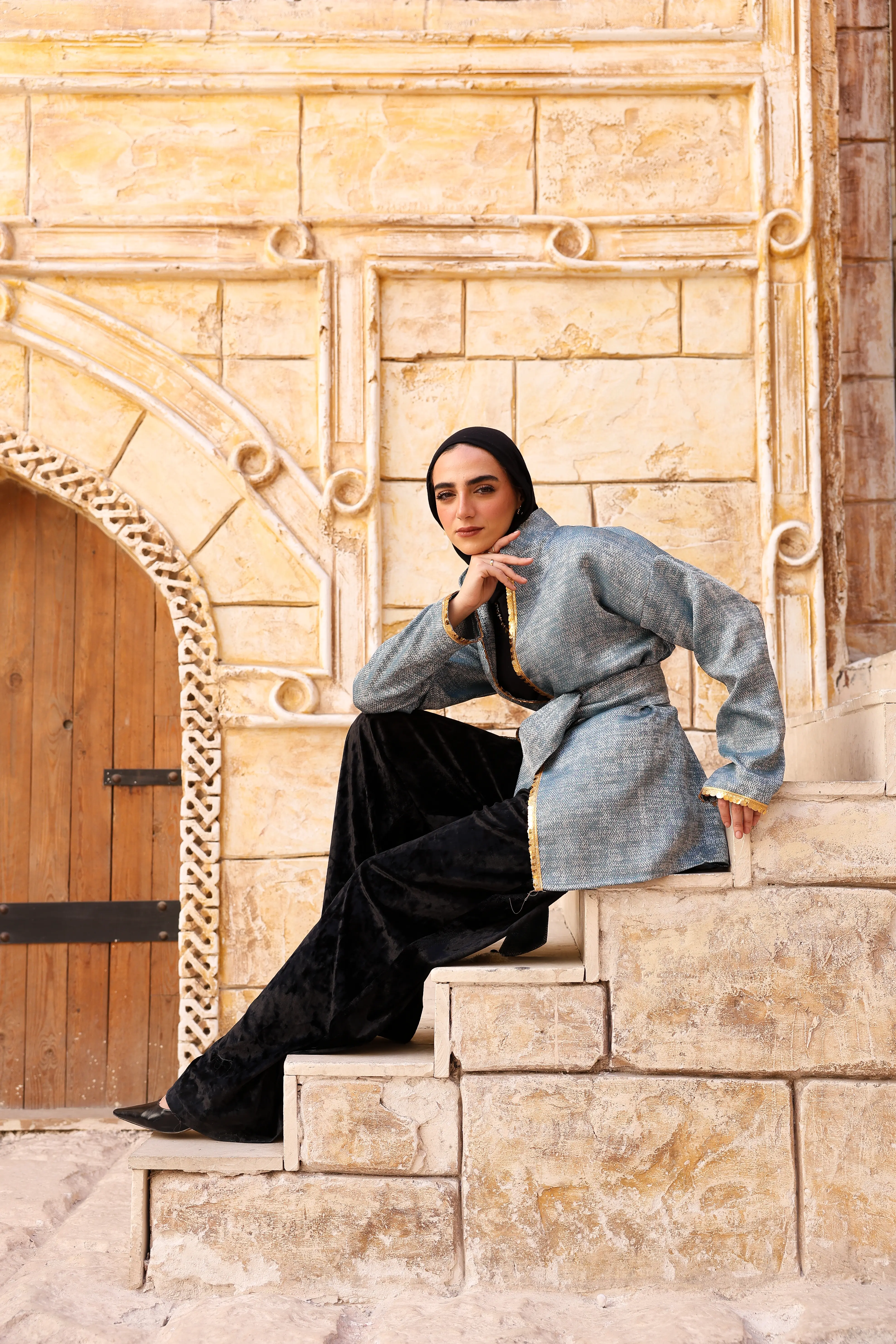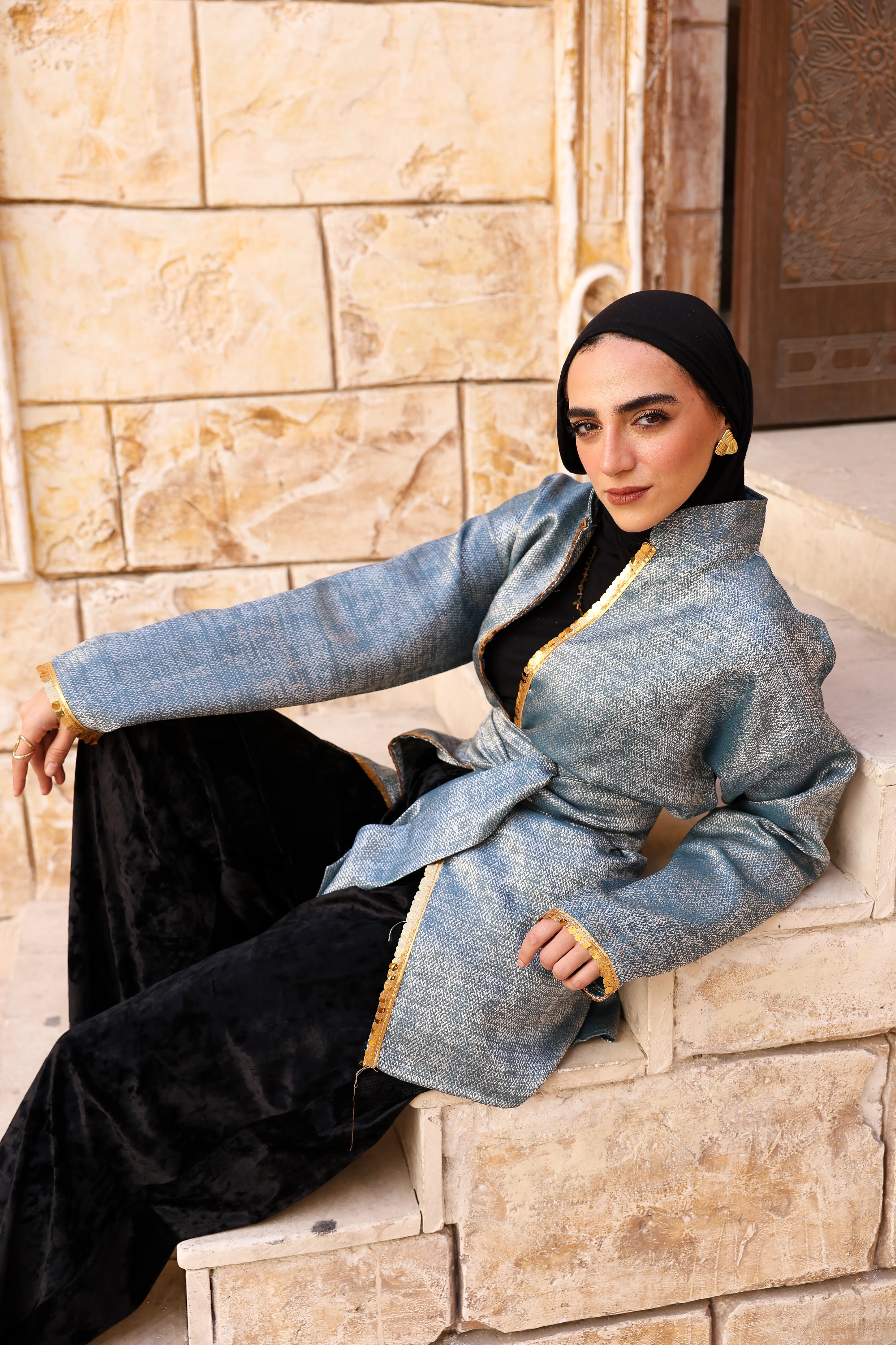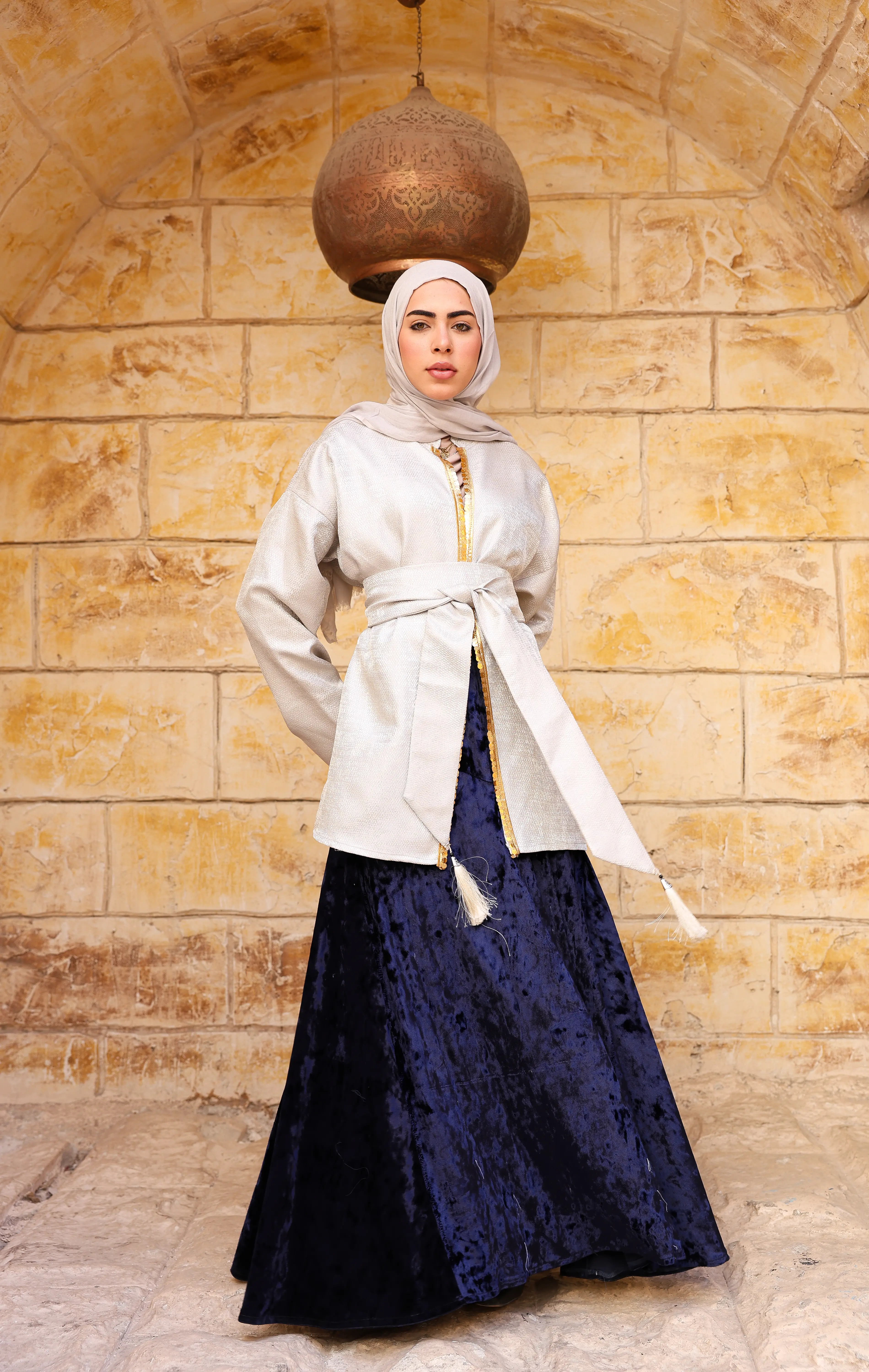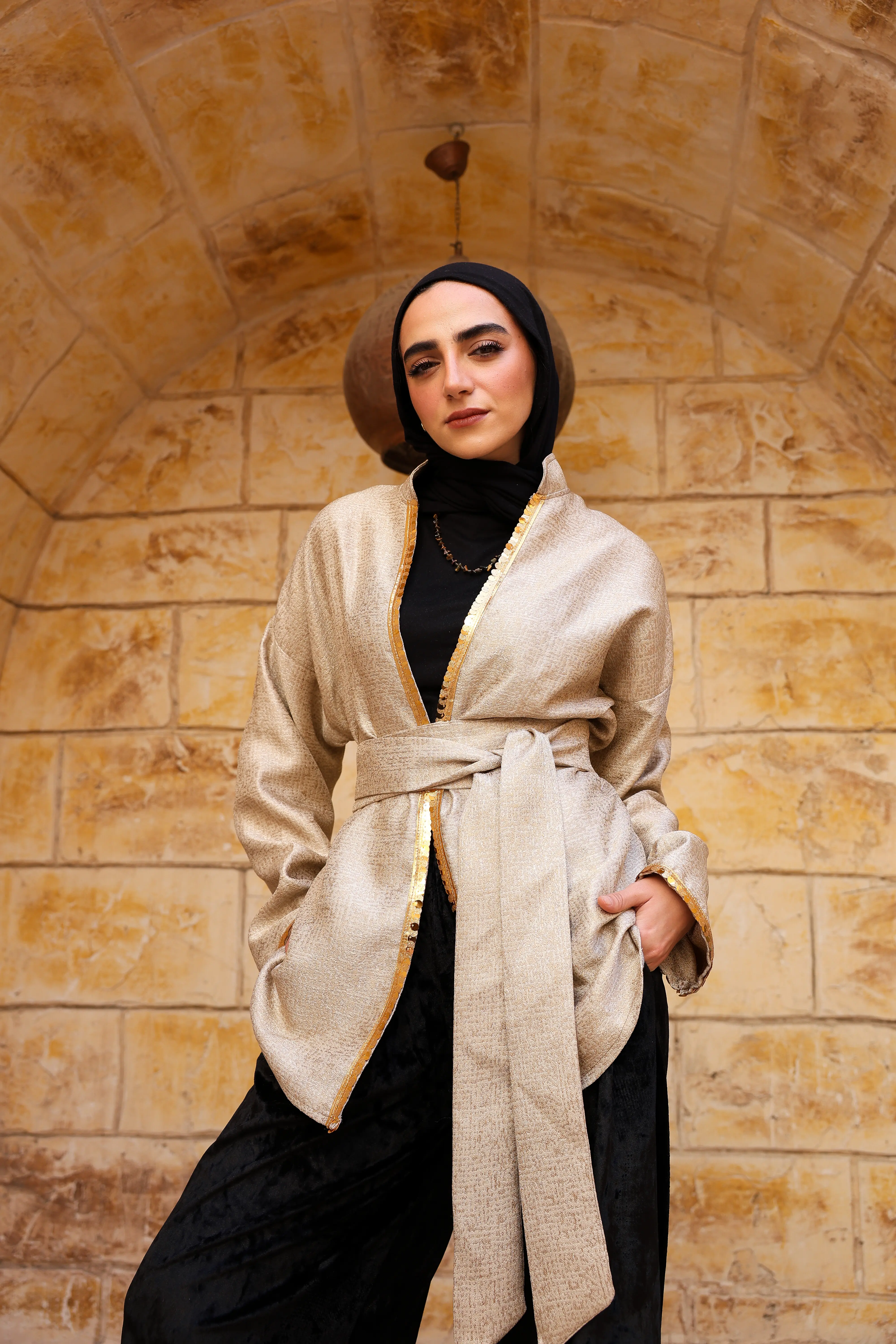 مصمم بقماش ناعم بلمعة خفيفة، مع تطريز ذهبي رقيق على الحواف يضيف فخامة هادئة. يأتي بحزام قابل للربط لتحديد الخصر وإبراز أنوثتك بأسلوب محتشم وشيك، مناسب للإطلالات الرمضانية والسهرات المميزة.